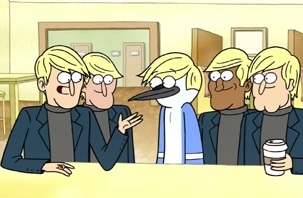 3. Mordecai is not immune to same-sex desire. When he loses a bet and is forced to dye his hair blond, he attracts a group of blond, beautiful people -- all male -- who encourage him to leave Rigby. Apocalyptic terror follows.