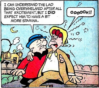 Comics. Comic book and comic strip characters saying and doing fun things, especially things that, taken out of context, sound dirty. Looks like Mr. Magoo's sexual expertise was too much for the twink he hooked up with.