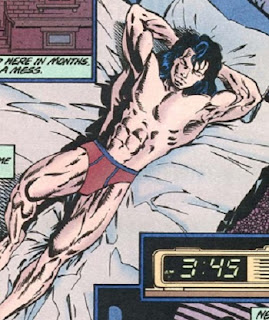 Batman and Robin. I have a whole folder of pics of the Caped Crusader and the Boy Wonder, both canonical and fan art. Nightwing -- Robin all grown up -- shows a fabulous physique but no basket in this canonical drawing.