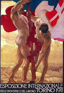 Fine Art. Lots of reproductions of male beauty in statues and paintings. Franz Metzner was a German sculptor known for his stylized musclemen. In this poster, two nude men are hoisting a flag to celebrate the International Exposition of Industry and Labor in Turin in 1911.