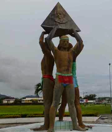 At the entrance to the city, three people holding up a pyramid symbolize the African, European, and Indian races who constitute Guiana. The Indian apparently has quite an endowment.