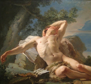 Endymion is a favorite of artists interested in depicting muscular men who aren't being killed or trying to kill someone. Usually Selena or Diana is hanging around, but it's pretty obvious that she's not getting anywhere with him, as in this painting by Francesco Trevisani (1656-1746).