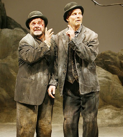 Happy Days: in a horrible postapocalyptic world, a woman who is slowly sinking into the ground tries to carry on her daily routines, while her husband (left) walks backwards.