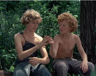 Born in 1957, the tall, lanky, curly-haired teenager made a string of Disney moves in the mid-1970s, all set on the 19th century frontier. However, Disney curtailed the shirtless shots that made Robbie Benson's Westerns a success -- Jeff displayed his chest (and nude backside) only in Tom Sawyer (1973) and Huckleberry Finn (1974), when he was barely pubescent.(That's a surprisingly muscular Johnny Whitaker next to him).