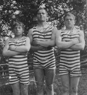 The Sjostrom Brothers, wearing the top fashion in men's swimsuits in 1912. Helmer, in the middle, is 18 years old, and shows a sizeable basket.