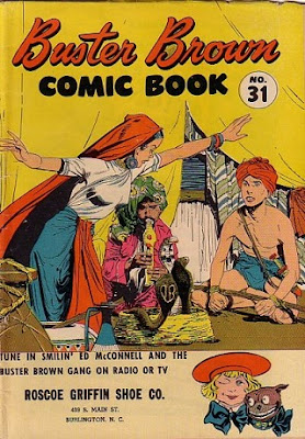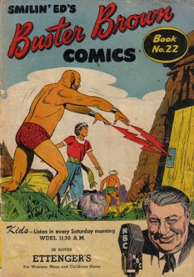 With a tie-in comic book, Buster Brown Comics. 45 issues were published between 1945 to 1946. You could get them for free at local shoe stores and department stores, which conveniently printed their addresses on the front cover -- presumably while picking up your comic, you (or Mom) would do some shopping.