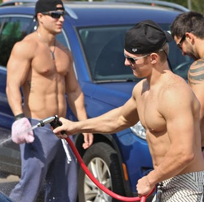 The attraction, of course, is that they're washing with their shirts off, allowing you to gawk at their spectacular physiques.