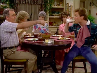(Side note: who sits at the dinner table with their chair pulled out and their legs spread? Unless their director said "Make sure your bulge is visible."