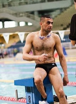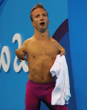 Arnost Petracek from the Czech Republic, a gold medal winner in the 50 m backstroke. Nice abs and basket, and have you ever seen a neck like that?