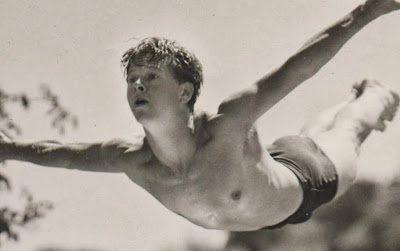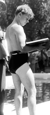 The producers countered by displaying Andy's muscles as much as possible. He strips down for bed; he bounces down the stairs shirtless; he goes swimming, even in winter, and in a revealing Speedo-style swimsuit. As much as 30% of each Andy Hardy movie is devoted to beefcake shots of Mickey's body and bulge.