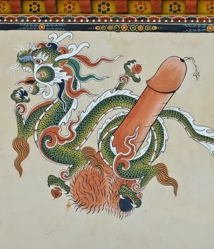This penis imagery is unique to Bhutan. Scholars trace it to Bon, the Himalayan religion that predates Buddhism, and more directly to the teachings of the "crazy saint" Drukpa Kunley (1455-1529), who was sexually voracious, and apparently a big fan of the penis.